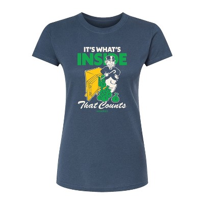 Monopoly - Its Whats Inside That Counts - Women's Short Sleeve Graphic T-Shirt - Show off your inner mogul with Monopoly graphic apparel featuring Mr. Monopoly (Rich Uncle Pennybags), Chance cards, and iconic game pieces like the dog, car, and top hat. It’s a stylish nod to board game domination.