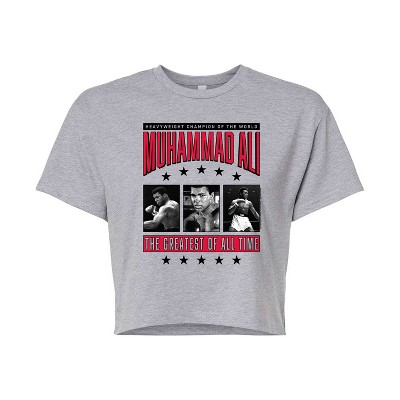 Muhammad Ali - Collage - Juniors Cropped Short Sleeve Graphic T-Shirt - Float like a butterfly and sting like a bee in Muhammad Ali graphic apparel. Celebrate the boxing legend’s bold spirit, unforgettable moments, and powerful quotes with designs that pack a punch.