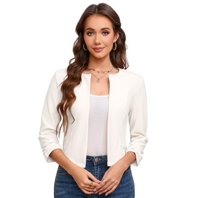 Versatile 3/4 Sleeves: Designed with ruched 3/4 sleeves, this jacket offers a stylish and comfortable option for year-round wear in the office or at business events.