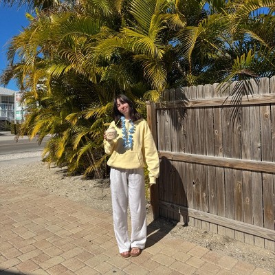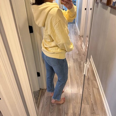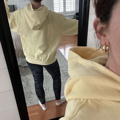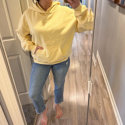 [This review was collected as part of a promotion.] This women’s soft yellow oversized hoodie is super comfy. I feel like it is just the right amount of oversized and not super baggy. The inside fleece makes it so cozy and definitely keeps you warm! I would say this is true to size unless you don’t it to be oversized then I would size down one size.