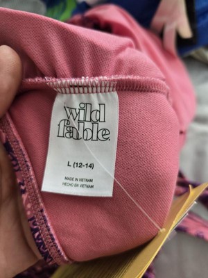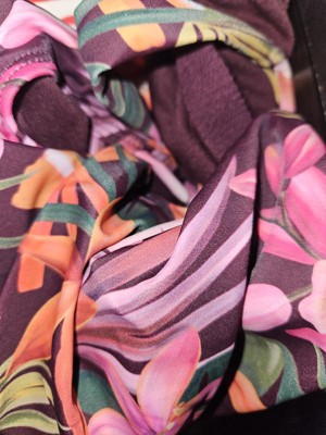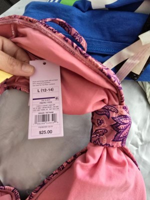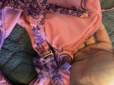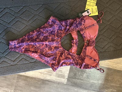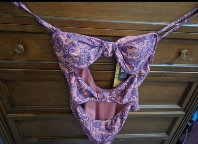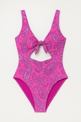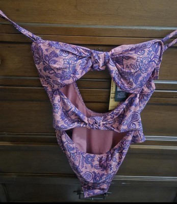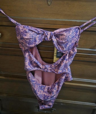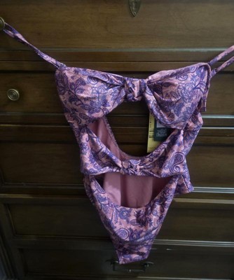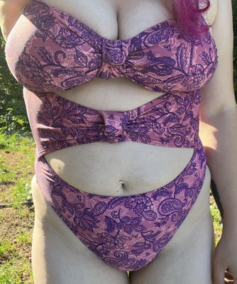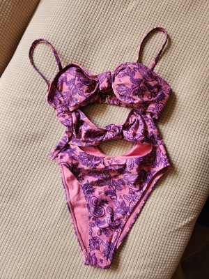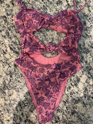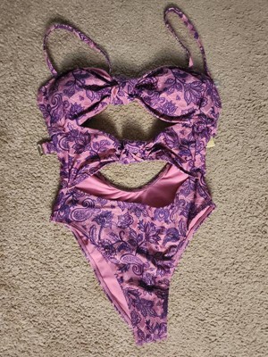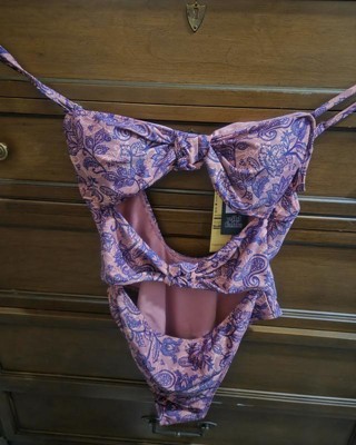 Pink and purple swimsuit from Wild Fable™ covered with paisley print. Knotted front with cutout detailing elevates the look. Made from recycled polyester-spandex blend fabric with full lining for stretchy comfort in and out of the water. Extra-high-leg design provides extra-cheeky coverage. Removable cups offer customizable coverage, while the back hook provides a snug fit.