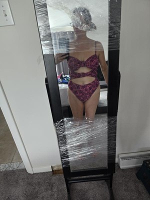 Women’s swimsuit one piece but cut out to show a lot of skin. High cut in legs and cheeky back reveal. Pretty colors and pattern. Removable pads in bust area. Adjustable straps. Hook in back. Nice for summer.