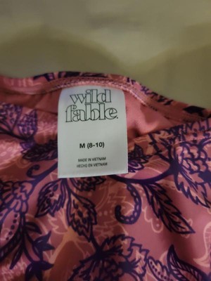 Low rise, high leg cheeky bikini bottom by Wild Fable, Size XL colors pink and purple very juvenile design and pattern, shell and lining made by 80% recycled polyester, material feels comfortable, Item made in Vietnam.