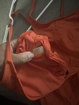 Surprisingly cute and well made swim suit! The embroidery of the palm trees on the swim suit makes it look very elegant and expensive. The orange color doesn’t look as bright in person as it does in the model picture. The color is really a rust color as it looks to me. Full coverage in the back is wonderful and the adjustable straps are so nice to get a perfect fit.