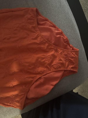 Nice orange suit with embroidered palm trees. The orange is definitely a tangerine with a hint of red. Very bright and pretty. Full coverage on rear but I wish it had a bit more support for the ladies and a bit more tummy control which it lacks.