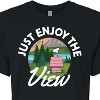 Peanuts - Just Enjoy The View - Juniors Cropped Cotton Blend T-Shirt - From the best-loved comic strip in history comes officially licensed PEANUTS apparel for fans everywhere. Show your love for Charlie Brown, Snoopy, Woodstock, Lucy, Linus, Pigpen and the whole gang. Copyright Peanuts.
