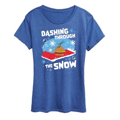 Peanuts - Dashing Through The Snow - Women's Short Sleeve Graphic T-Shirt - From the best-loved comic strip in history comes officially licensed PEANUTS apparel for fans everywhere. Show your love for Charlie Brown, Snoopy, Woodstock, Lucy, Linus, Pigpen and the whole gang. Copyright Peanuts.
