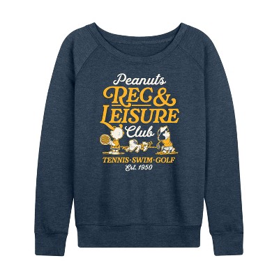 Women's Peanuts Feeling Fierce Snoopy Lightweight French Terry Wide Neck Long Sleeve Graphic Shirt - Heather Indigo - Medium