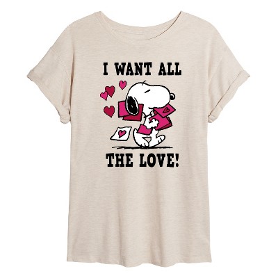 Peanuts - Gimme All the Love - Juniors Oversized Graphic T-Shirt - From the best-loved comic strip in history comes officially licensed PEANUTS apparel for fans everywhere. Show your love for Charlie Brown, Snoopy, Woodstock, Lucy, Linus, Pigpen and the whole gang. Copyright Peanuts.