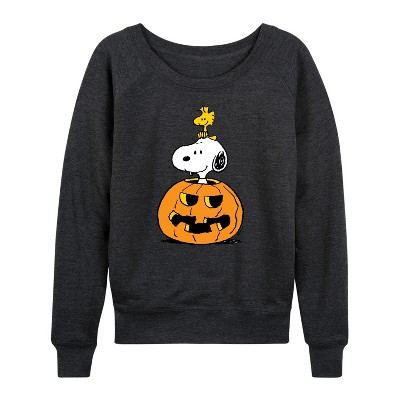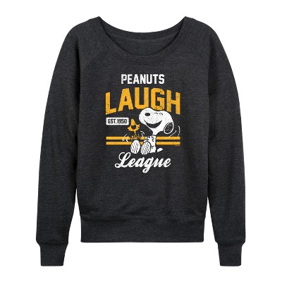 Women's Peanuts Good Grief Academy Lightweight French Terry Wide Neck Long Sleeve Graphic Shirt - Heather Charcoal - X-Large