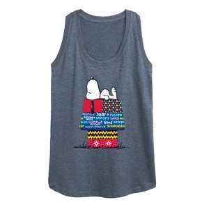 Peanuts - Snoopy Patchwork Doghouse - Women's Racerback Tank Top - From the best-loved comic strip in history comes officially licensed PEANUTS apparel for fans everywhere. Show your love for Charlie Brown, Snoopy, Woodstock, Lucy, Linus, Pigpen and the whole gang. Copyright Peanuts.