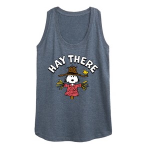Peanuts - Snoopy Scarecrow Hay There - Women's Racerback Tank Top - From the best-loved comic strip in history comes officially licensed PEANUTS apparel for fans everywhere. Show your love for Charlie Brown, Snoopy, Woodstock, Lucy, Linus, Pigpen and the whole gang. Copyright Peanuts.