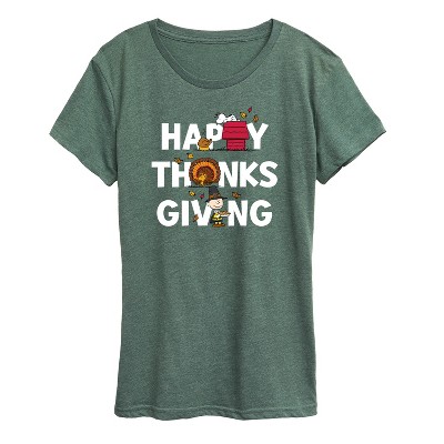 Peanuts - Happy Thanksgiving Icons - Women's Short Sleeve Graphic T-Shirt - From the best-loved comic strip in history comes officially licensed PEANUTS apparel for fans everywhere. Show your love for Charlie Brown, Snoopy, Woodstock, Lucy, Linus, Pigpen and the whole gang. Copyright Peanuts.