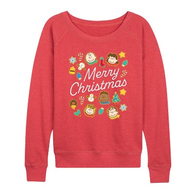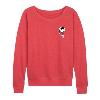 Women's Peanuts Joe Cool Pattern Lightweight French Terry Wide Neck Long Sleeve Graphic Shirt - Heather Red - Large