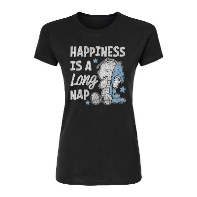 Peanuts - Happiness is a Long Nap - Women's Short Sleeve Graphic T-Shirt - From the best-loved comic strip in history comes officially licensed PEANUTS apparel for fans everywhere. Show your love for Charlie Brown, Snoopy, Woodstock, Lucy, Linus, Pigpen and the whole gang. Copyright Peanuts.