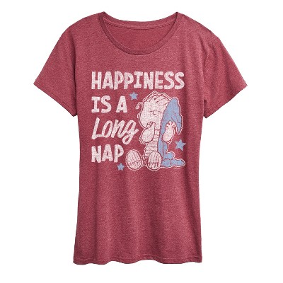Peanuts - Happiness is a Long Nap - Women's Short Sleeve Graphic T-Shirt - From the best-loved comic strip in history comes officially licensed PEANUTS apparel for fans everywhere. Show your love for Charlie Brown, Snoopy, Woodstock, Lucy, Linus, Pigpen and the whole gang. Copyright Peanuts.