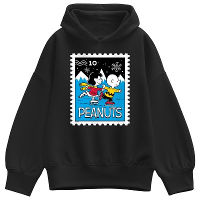 Women's Peanuts Lucy Charlie Winter Stamp Oversized Fleece Crew Sweatshirt - Black - X-Large