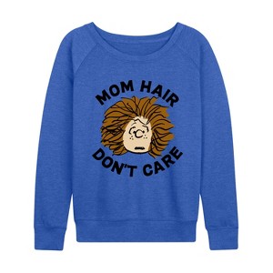 Women's Peanuts Mom Hair Dont Care Lightweight French Terry Wide Neck Long Sleeve Graphic Shirt - Heather Royal Blue - 3X