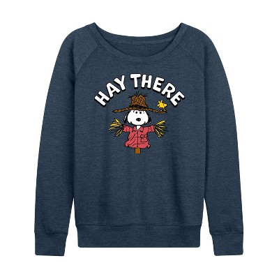 Women's Peanuts Snoopy Heart Throb Lightweight French Terry Wide Neck Long Sleeve Graphic Shirt - Heather Indigo - Large