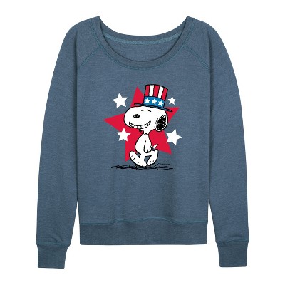 Women's Peanuts Snoopy On Flag Heart Lightweight French Terry Wide Neck Long Sleeve Graphic Shirt - Heather Indigo - Medium