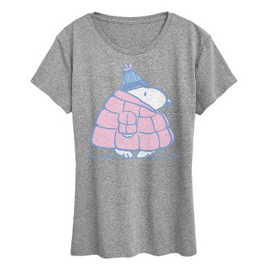 Peanuts - Snoopy Puffer Coat Snow - Women's Short Sleeve Graphic T-Shirt - From the best-loved comic strip in history comes officially licensed PEANUTS apparel for fans everywhere. Show your love for Charlie Brown, Snoopy, Woodstock, Lucy, Linus, Pigpen and the whole gang. Copyright Peanuts.