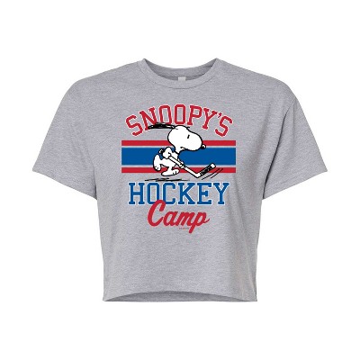 Peanuts - Snoopy's Hockey Camp - Juniors Cropped Cotton Blend T-Shirt - From the best-loved comic strip in history comes officially licensed PEANUTS apparel for fans everywhere. Show your love for Charlie Brown, Snoopy, Woodstock, Lucy, Linus, Pigpen and the whole gang. Copyright Peanuts.