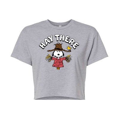 Peanuts - Snoopy Scarecrow Hay There - Women's Short Sleeve Graphic T-Shirt - From the best-loved comic strip in history comes officially licensed PEANUTS apparel for fans everywhere. Show your love for Charlie Brown, Snoopy, Woodstock, Lucy, Linus, Pigpen and the whole gang. Copyright Peanuts.