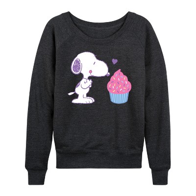 Women's - Peanuts - Snoopy Stacked Macarons Lightweight French Terry Wide Neck Long Sleeve Graphic Shirt