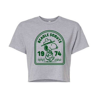 Women's Peanuts Snoopy Woodstock Beagle Scout Crew 1974 Cropped Graphic T-Shirt - Heather Grey - Large