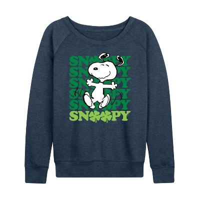 Women's Peanuts Snoopy Woodstock Pumpkin Lightweight French Terry Wide Neck Long Sleeve Graphic Shirt - Heather Indigo - Medium