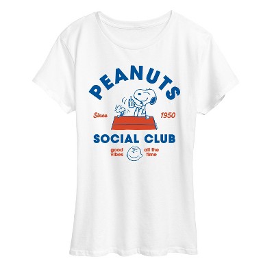 Peanuts - Social Club - Women's Short Sleeve Graphic T-Shirt - From the best-loved comic strip in history comes officially licensed PEANUTS apparel for fans everywhere. Show your love for Charlie Brown, Snoopy, Woodstock, Lucy, Linus, Pigpen and the whole gang. Copyright Peanuts.