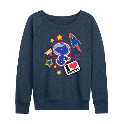 Women's Peanuts Sorcerer Snoopy Woodstock Lightweight French Terry Wide Neck Long Sleeve Graphic Shirt - Heather Indigo - Medium
