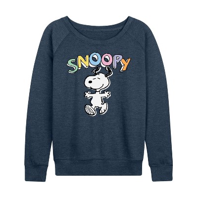 Women's Peanuts Space Snoopy Flair Lightweight French Terry Wide Neck Long Sleeve Graphic Shirt - Heather Indigo - Large