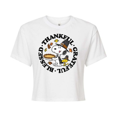 Peanuts - Thankful Grateful Blessed - Women's Short Sleeve Graphic T-Shirt - From the best-loved comic strip in history comes officially licensed PEANUTS apparel for fans everywhere. Show your love for Charlie Brown, Snoopy, Woodstock, Lucy, Linus, Pigpen and the whole gang. Copyright Peanuts.
