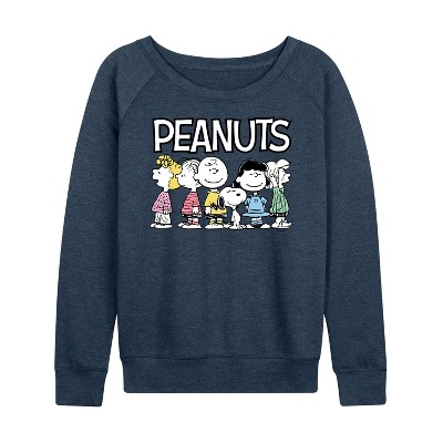 Women's Peanuts Time To Polka Lightweight French Terry Wide Neck Long Sleeve Graphic Shirt - Heather Indigo - Large