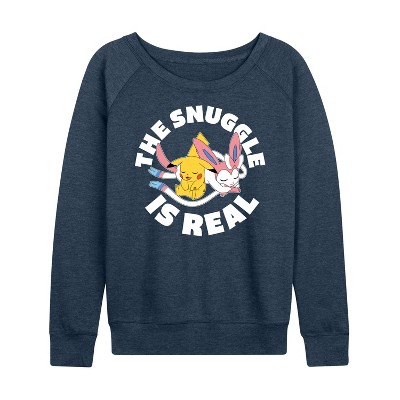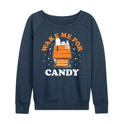 Women's Peanuts Wake Up And Chase Dreams Lightweight French Terry Wide Neck Long Sleeve Graphic Shirt - Heather Indigo - Small