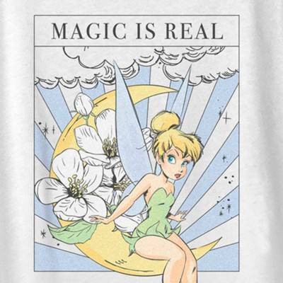 Sprinkle a little fairy dust into your day with this cute new Disney Peter Pan Tinker Bell Magic is Real Tarot Card Women's Graphic Scoop Neck T-Shirt! This fun women's design features your favorite Disney fairy, Tinker Bell, sitting on a half-crescent moon with the phrase: "Magic is real," all in a tarot card design. Dress in a Pixie style this season with this new graphic tee today that is perfect for Disney fans everywhere!