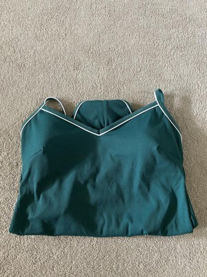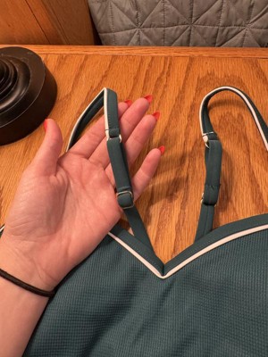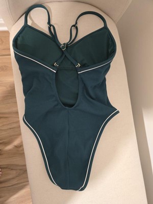 I LOVE this one-piece bathing suit! The dark green color with white piping is so pretty and gives it a really chic look. The high leg cut is a little cheeky but just the right amount, flattering without being too revealing. The back straps are adjustable so you can fit it exactly how you like, and it has removable padding in the chest area. It fits true to size and is super flattering overall. This will definitely be one of my favorite swimsuits all summer long!