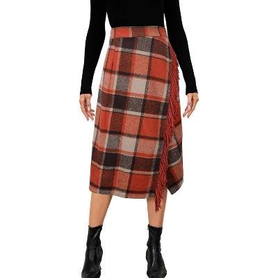 - Design: Plaid wrap skirt in a midi silhouette featuring fringe trim for a unique and stylish touch. Side slit and fringe enhance femininity. Waist with double buttons closure for a perfect fit