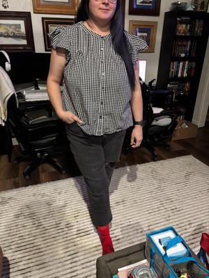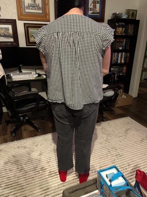 Plus-size plaid top design: Features a crew neck and button closure, paired with ruffled short sleeves and back pleats, presenting a retro 1950s plaid style
