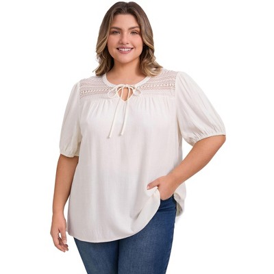 Women's Plus Size Textured Pintuck Notch Neck 3/4 Sleeve Loose Casual Button Down Shirts - GRACE & GRANDEUR 1X White