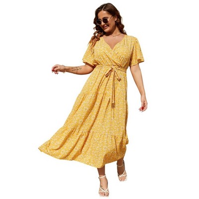 Product Name: Women's Plus Size V-Neck Maxi Dress: Flowy Boho Elegance for Vacations & Garden Soirees DressSmall yellow flowers,3XL