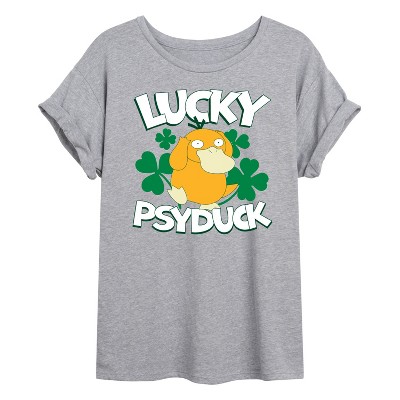 Pokémon - Lucky Psyduck - Women's Short Sleeve Graphic T-Shirt - Celebrate the essence of Pokemon's Pokémon with officially licensed apparel featuring unique designs crafted exclusively by Hybrid Apparel. Each piece brings beloved characters, iconic imagery, and memorable moments to life, offering Pokémon fans a one-of-a-kind way to showcase their passion.