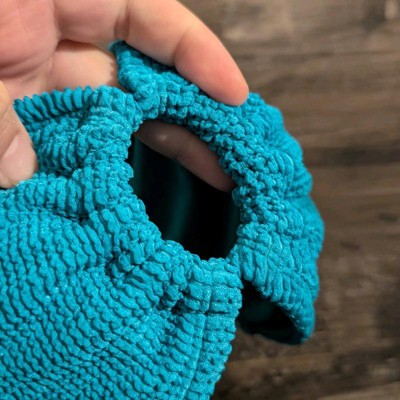 Bandeau bikini top from Wild Fable™ with a jacquard-knit pucker texture in solid shade and an oval-ring accent at the center front. Comes with adjustable, detachable shoulder straps. Made from recycled fabric with spandex and full lining for flexible comfort in and out of the water. Features an adjustable back strap with a hook-and-loop closure for a customizable, stay-put fit.