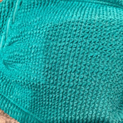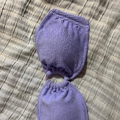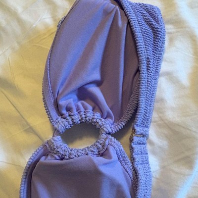 [This review was collected as part of a promotion.] This jacquard knit bandeau bikini top is a beautiful shade of purple. The ring center adds a nice detail and the fabric is thick to prevent any see through-ness. The pads are removable which is annoying but they aren’t too thick and bulky. It comes with removeable straps for extra support. I followed the size chart and ordered a L based on my usual bra size 36D but I found it to be a little too small for me. I need more support than a bandeau can provide I guess. Cute suit top though!