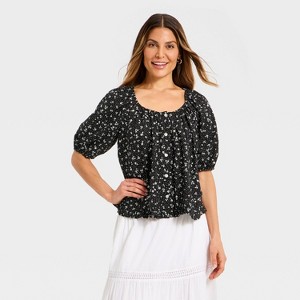 Women's Puff Short Sleeve Button-Up Peasant Top - Universal Thread™ Black Floral XS
