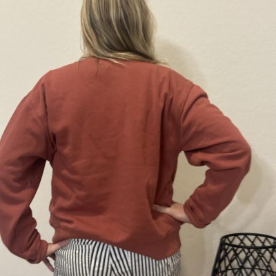 [This review was collected as part of a promotion.] There are four color choices in this sweatshirt. I bought the rust color because it is eyecatching and perfect for the Fall weather ahead. I am 5 ft 6 tall and the sleeves were way too long on me. I folded the cuffs and they were still long. I bought a size Medium and I normally wear a size 8. I think the small may be better on me. It is handy for casual wear and for the gym. I received an incentive to write this review.