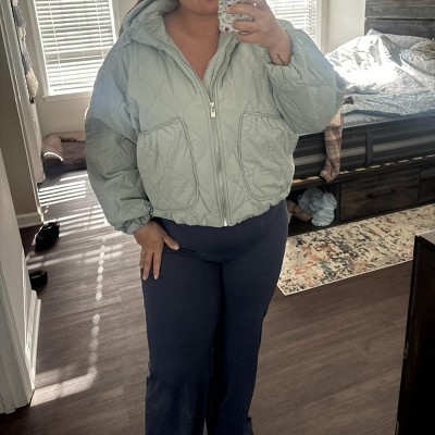 So big, boxy, puffy, and uncomfortable. I was hoping this was like last year’s packable version, but it’s not even close. The bottom has elastic that makes it bunch up and feel cropped and puffy. Green color is pretty and love the quilted pattern, but it misses the mark in other areas.