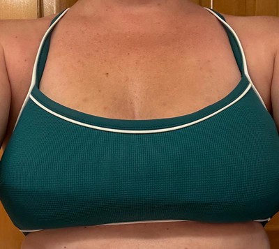 This racer back piping bralette in forest green color is very comfortable. This is a nice sporty swim top. My teen daughter really likes it and it pairs well with a black swim short. I got a size S and it fit perfectly on my teen who wears XS-S tops. The only downside is that the straps are not adjustable.