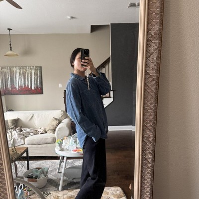 I really like the wash of this and it looks cute on but size up if you like oversized or just want to wear it as an overshirt which I think is best since it’s a thick denim. I’m skinny with a small bust but 5’8” with long arms and wider shoulders and I needed a size L. The interior is very light colored and makes it look a bit cheap and I’m kind of tired of curved hems but overall I like it.